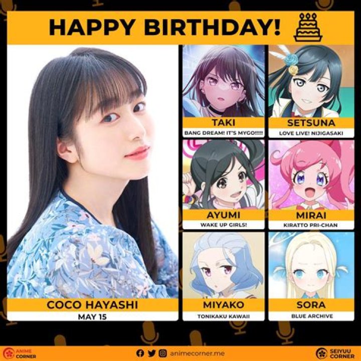 Coco Hayashi (林 鼓子 , Hayashi Koko, born 15 May 2002) is a Japanese actress and voice actress associated with 81 Produce and Avex Pictures. She is best known for voicing Ayumi Hayashi in Wake Up, Girls! New Chapter! and Mirai Momoyama in Kiratto Pri Chan.