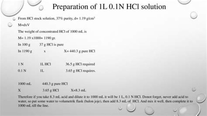 V2 = Volume of dilute acid to be prepared = 250 ml. Therefore 104.2 ml of concentrated acid should be taken and diluted with water to make the volume 250 ml. The resulting solution will be 5N HCl.How do you make 1N HCl?