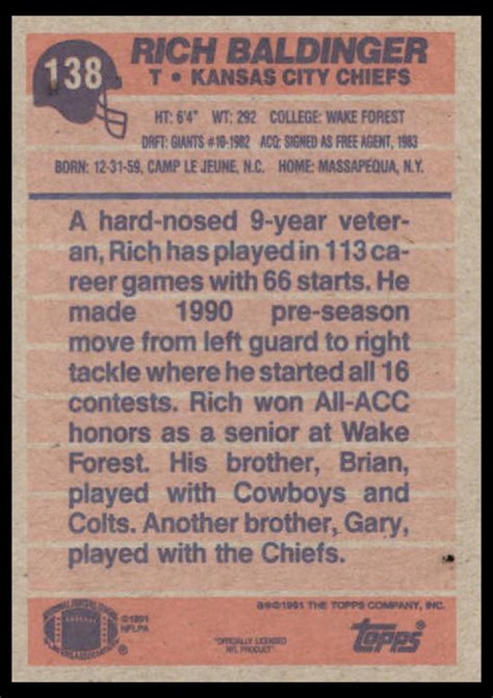 Rich Baldinger is one of Brian’s younger brothers. Like his brother, he also graduated from Massapequa High School and played in the NFL. Rich Baldinger played his college football with his other brother Gary at Wake Forest before moving onto the NFL.